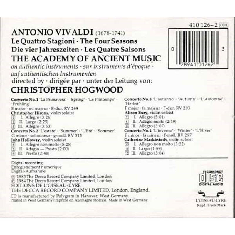 Le Quattro Stagioni = The Four Seasons ~ Antonio Vivaldil ~ CD ~ VG