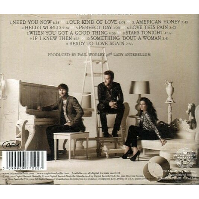 2010 album from the slick Country trio. Lady Antebellum (Dave Haywood, Charles Kelley, and Hillary Scott), the 2009 CMA Vocal Group of the Year, has taken the Country Music world by storm. The group's debut self-titled release, Lady Antebellum, has achieved platinum certification from the RIAA. The trio recently celebrated back-to-back #1 songs ('I Run To You' and 'Need You Now'). This sophomore album is one of the most antiicpated Country releases of the year, setting the band up to become one of the most successful acts of 2010!